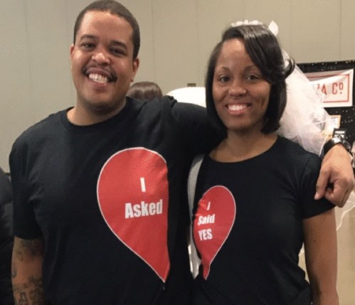 Heart split in two, husband-to-be and wife-to-be each bearing a half. One half stating "I asked" the other stating "I said 'yes' ".
